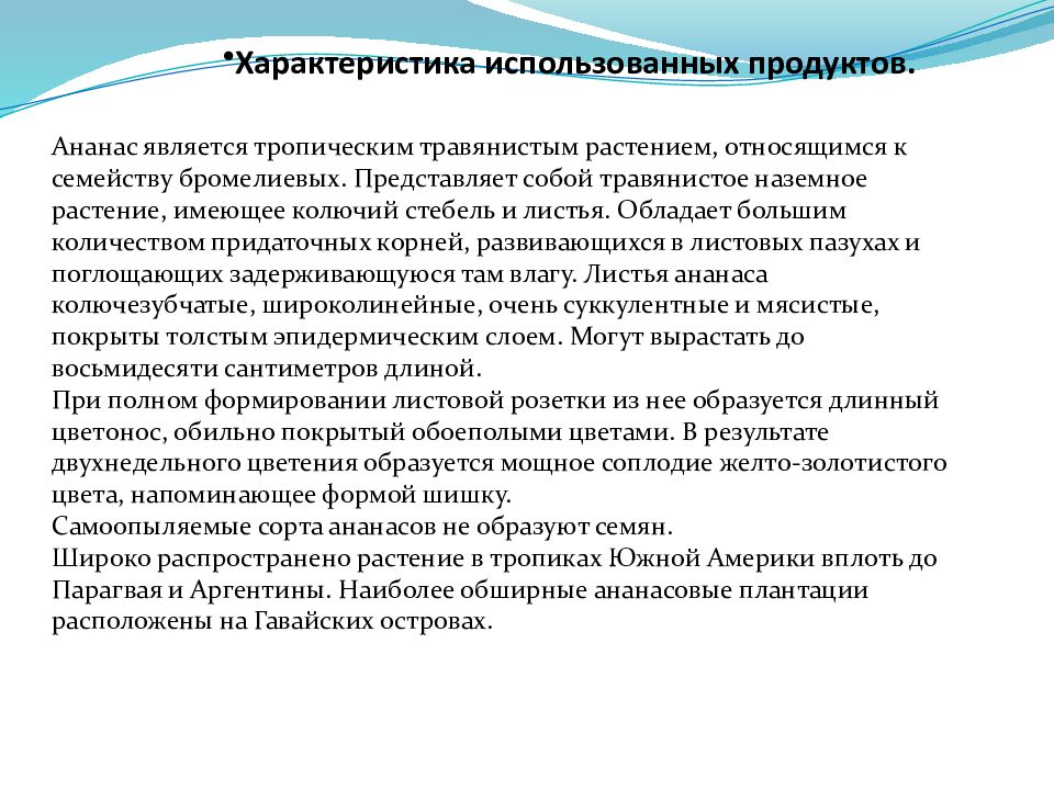 Характеристика использованных продуктов. Ананас является тропическим травянистым растением, относящимся к семейству бромелиевых. Представляет собой травянистое наземное растение, имеющее колючий стебель и листья. Обладает большим количеством придаточных корней, развивающихся в листовых пазухах и поглощающих задерживающуюся там влагу. Листья ананаса колючезубчатые, широколинейные, очень суккулентные и мясистые, покрыты толстым эпидермическим слоем. Могут вырастать до восьмидесяти сантиметров длиной. При полном формировании листовой розетки из нее образуется длинный цветонос, обильно покрытый обоеполыми цветами. В результате двухнедельного цветения образуется мощное соплодие желто-золотистого цвета, напоминающее формой шишку. Самоопыляемые сорта ананасов не образуют семян. Широко распространено растение в тропиках Южной Америки вплоть до Парагвая и Аргентины. Наиболее обширные ананасовые плантации расположены на Гавайских островах.