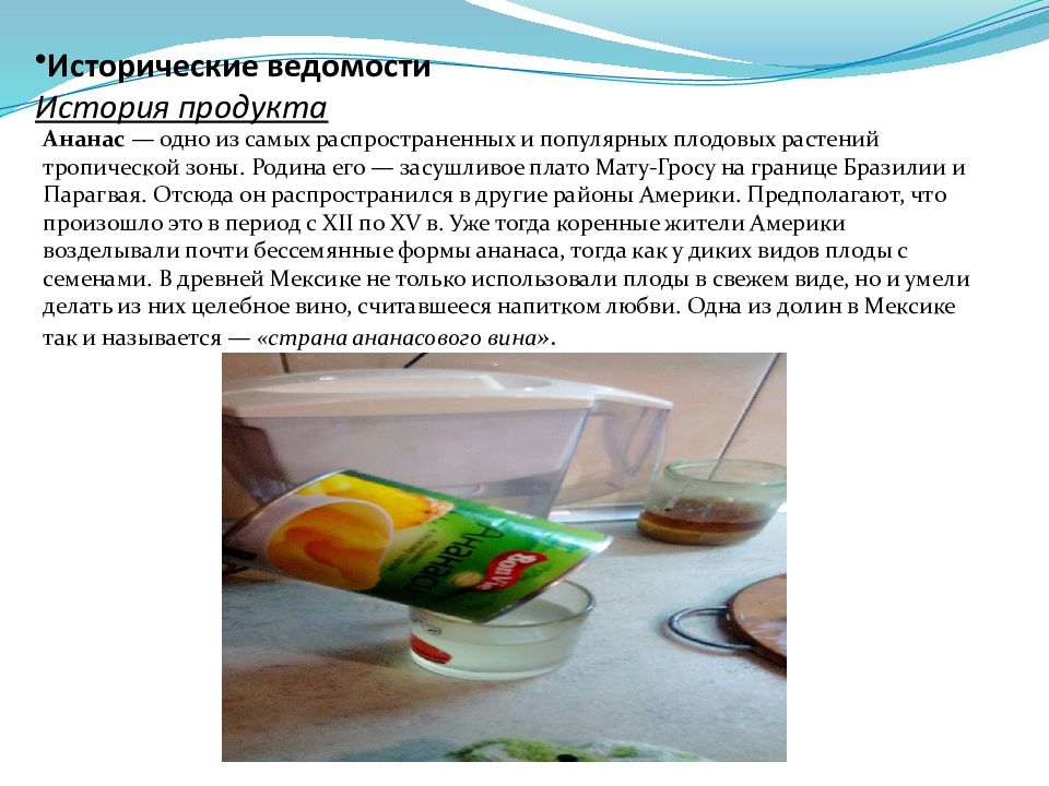 Исторические ведомости История продукта Ананас — одно из самых распространенных и популярных плодовых растений тропической зоны. Родина его — засушливое плато Мату-Гросу на границе Бразилии и Парагвая. Отсюда он распространился в другие районы Америки. Предполагают, что произошло это в период с XII по XV в. Уже тогда коренные жители Америки возделывали почти бессемянные формы ананаса, тогда как у диких видов плоды с семенами. В древней Мексике не только использовали плоды в свежем виде, но и умели делать из них целебное вино, считавшееся напитком любви. Одна из долин в Мексике так и называется — «страна ананасового вина ».