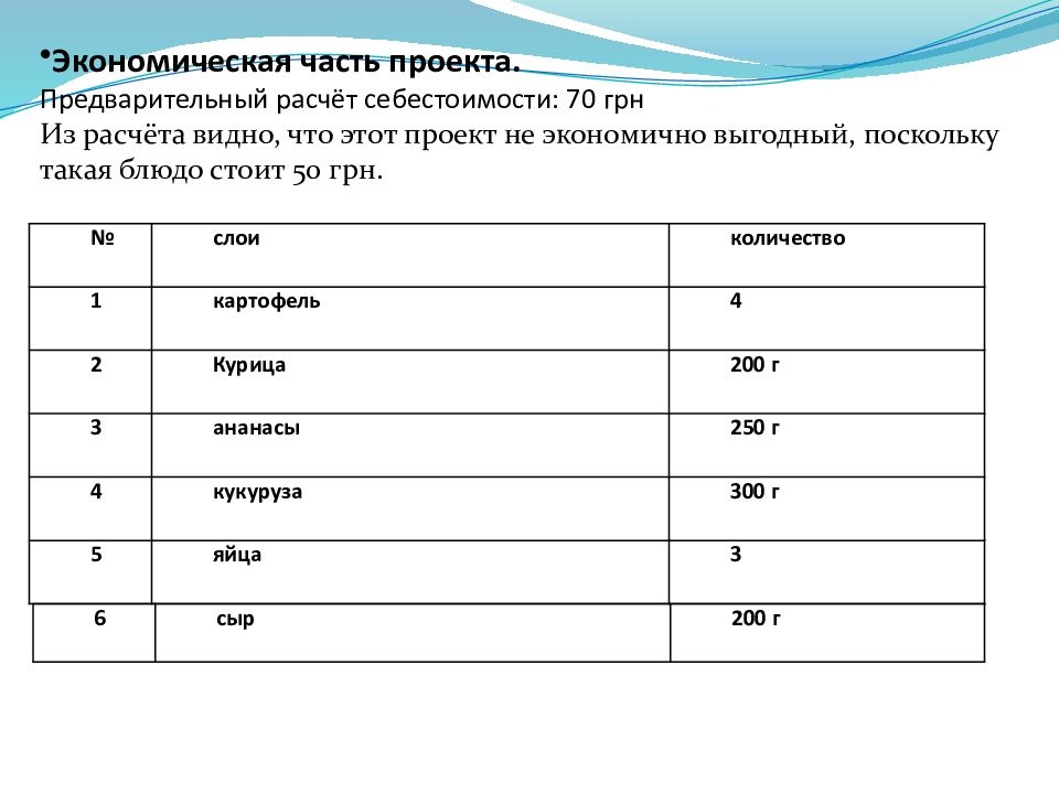Экономическая часть проекта. Предварительный расчёт себестоимости: 70 грн Из расчёта видно, что этот проект не экономично выгодный, поскольку такая блюдо стоит 50 грн. № слои количество 1 картофель 4 2 Курица 200 г 3 ананасы 250 г 4 кукуруза 300 г 5 яйца 3 6 сыр 200 г