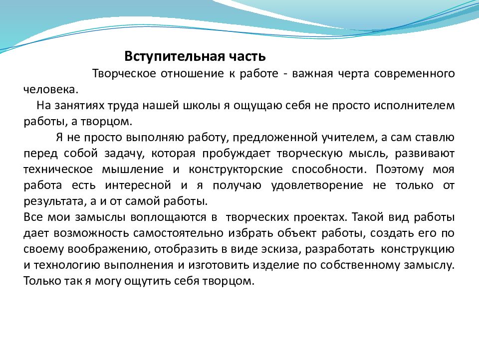 Вступительная часть Творческое отношение к работе - важная черта современного человека. На занятиях труда нашей школы я ощущаю себя не просто исполнителем работы, а творцом. Я не просто выполняю работу, предложенной учителем, а сам ставлю перед собой задачу, которая пробуждает творческую мысль, развивают техническое мышление и конструкторские способности. Поэтому моя работа есть интересной и я получаю удовлетворение не только от результата, а и от самой работы. Все мои замыслы воплощаются в творческих проектах. Такой вид работы дает возможность самостоятельно избрать объект работы, создать его по своему воображению, отобразить в виде эскиза, разработать конструкцию и технологию выполнения и изготовить изделие по собственному замыслу. Только так я могу ощутить себя творцом.