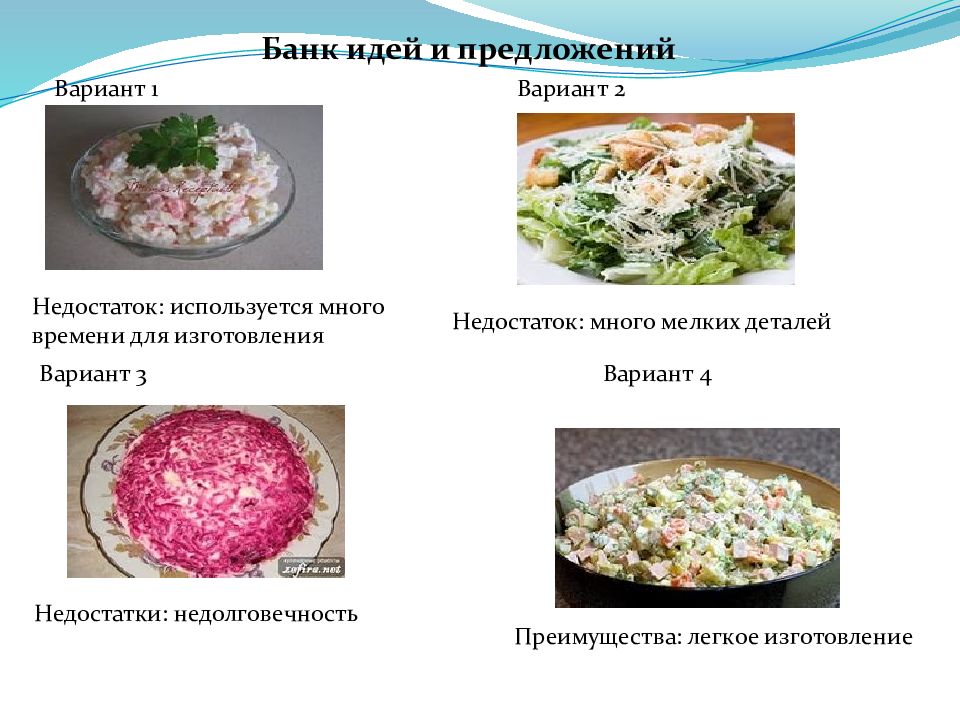 Банк идей и предложений Вариант 1 Вариант 2 Недостаток: используется много времени для изготовления Недостаток: много мелких деталей Вариант 3 Вариант 4 Недостатки: недолговечность Преимущества: легкое изготовление