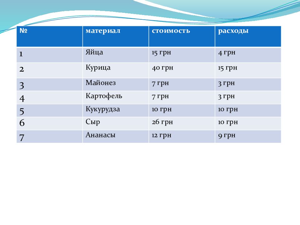 № материал стоимость расходы 1 Яйца 15 грн 4 грн 2 Курица 40 грн 15 грн 3 Майонез 7 грн 3 грн 4 Картофель 7 грн 3 грн 5 Кукурудза 10 грн 10 грн 6 Сыр 26 грн 10 грн 7 Ананасы 12 грн 9 грн