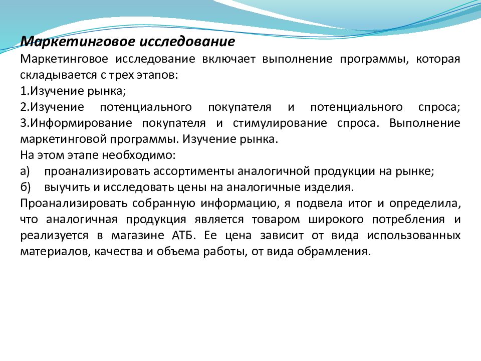 Маркетинговое исследование Маркетинговое исследование включает выполнение программы, которая складывается с трех этапов: 1.Изучение рынка; 2.Изучение потенциального покупателя и потенциального спроса; 3.Информирование покупателя и стимулирование спроса. Выполнение маркетинговой программы. Изучение рынка. На этом этапе необходимо: а) проанализировать ассортименты аналогичной продукции на рынке; б) выучить и исследовать цены на аналогичные изделия. Проанализировать собранную информацию, я подвела итог и определила, что аналогичная продукция является товаром широкого потребления и реализуется в магазине АТБ. Ее цена зависит от вида использованных материалов, качества и объема работы, от вида обрамления.