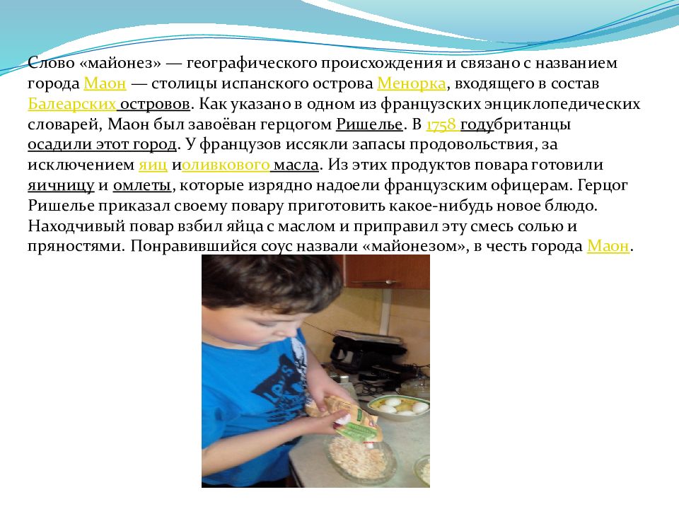 Слово «майонез» — географического происхождения и связано с названием города Маон — столицы испанского острова Менорка, входящего в состав Балеарских островов. Как указано в одном из французских энциклопедических словарей, Маон был завоёван герцогом Ришелье. В 1758 году британцы осадили этот город. У французов иссякли запасы продовольствия, за исключением яиц и оливкового масла. Из этих продуктов повара готовили яичницу и омлеты, которые изрядно надоели французским офицерам. Герцог Ришелье приказал своему повару приготовить какое-нибудь новое блюдо. Находчивый повар взбил яйца с маслом и приправил эту смесь солью и пряностями. Понравившийся соус назвали «майонезом», в честь города Маон.