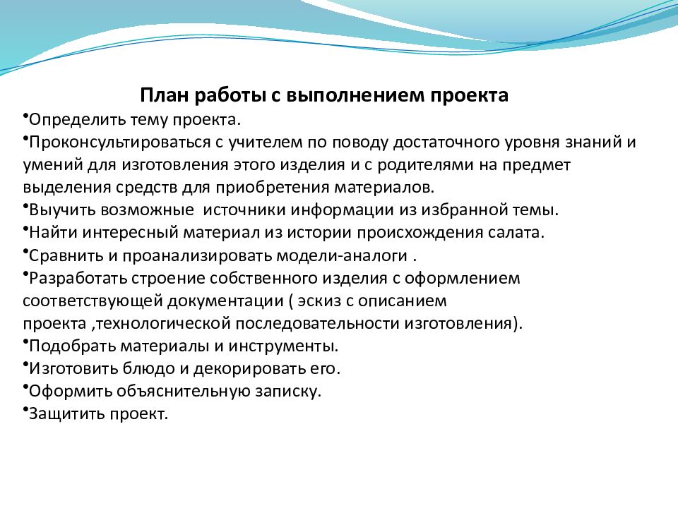 План работы с выполнением проекта Определить тему проекта. Проконсультироваться с учителем по поводу достаточного уровня знаний и умений для изготовления этого изделия и с родителями на предмет выделения средств для приобретения материалов. Выучить возможные источники информации из избранной темы. Найти интересный материал из истории происхождения салата. Сравнить и проанализировать модели-аналоги. Разработать строение собственного изделия с оформлением соответствующей документации ( эскиз с описанием проекта,технологической последовательности изготовления). Подобрать материалы и инструменты. Изготовить блюдо и декорировать его. Оформить объяснительную записку. Защитить проект.