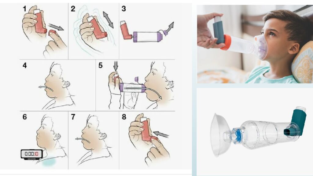 1.Спейсерде бөгде заттардың бар-жоғын тексеріңіз. 2.Ингаляторды шайқаңыз, қорғаныс қақпағын алыңыз және оны спейсерге бекітіңіз. 3.Баланың отыруын немесе тұруын қадағалаймыз. 4.Масканы баланың бетіне орналастырамыз-маска мұрын мен ауызды толық жабуы керек. 5.Дәріні шашамыз-ингаляторды бір рет басып, дәріні спейсердің ішіне жібереміз. 6.Бала баяу 5-6 рет терең тыныс алуы керек.Егер баланың жасы кішкентай болса оны бірнеше секунд маскамен ұстау қажет. Сізге басқа дәрі-дәрмектер тағайындалса, келесі дем алғанға дейін бір минут күтіңіз. ИНГАЛЯЦИЯДАН КЕЙІН : ингаляторды ажыратыңыз, қорғаныс қақпағын кигізіңіз. аралықты шайыңыз және құрғатыңыз (аптасына кемінде 1 рет жылы сумен жуып,кептіру керек) б аланың аузын сумен шайыңыз.