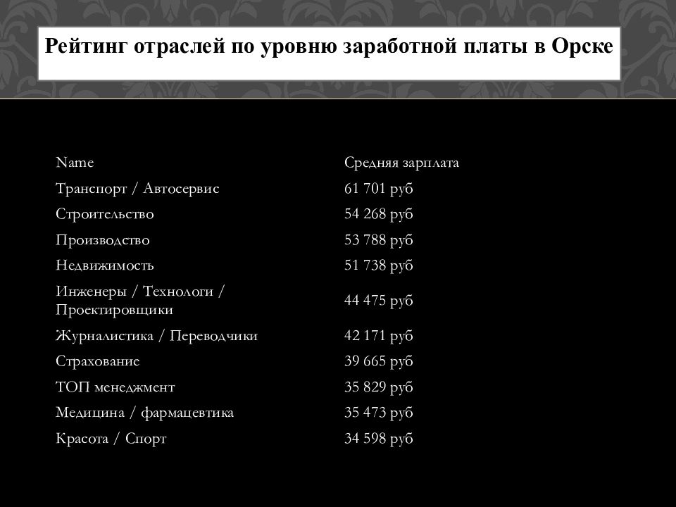 Name Средняя зарплата Транспорт / Автосервис 61 701 руб Строительство 54 268 руб Производство 53 788 руб Недвижимость 51 738 руб Инженеры / Технологи / Проектировщики 44 475 руб Журналистика / Переводчики 42 171 руб Страхование 39 665 руб ТОП менеджмент 35 829 руб Медицина / фармацевтика 35 473 руб Красота / Спорт 34 598 руб Рейтинг отраслей по уровню заработной платы в Орске