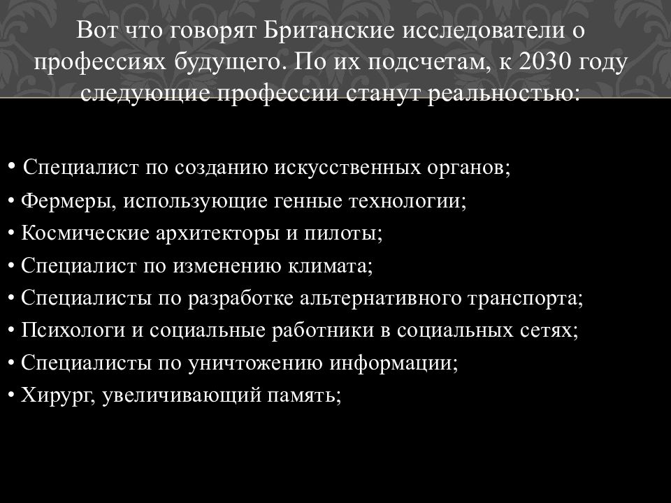 Вот что говорят Британские исследователи о профессиях будущего. По их подсчетам, к 2030 году следующие профессии станут реальностью : • Специалист по созданию искусственных органов; • Фермеры, использующие генные технологии; • Космические архитекторы и пилоты; • Специалист по изменению климата; • Специалисты по разработке альтернативного транспорта; • Психологи и социальные работники в социальных сетях; • Специалисты по уничтожению информации; • Хирург, увеличивающий память;