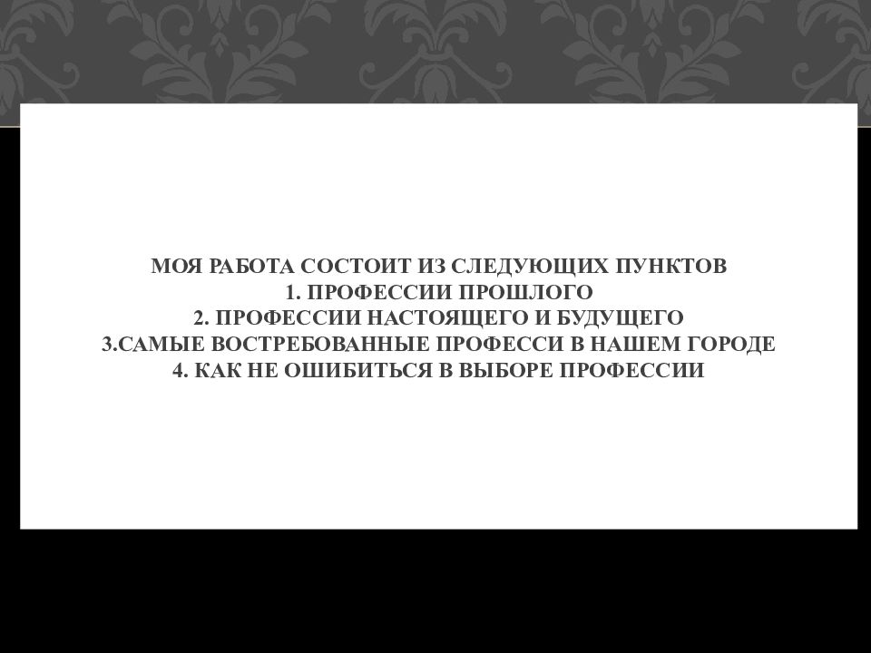 Слайд 2: Моя работа состоит из следующих пунктов 1. Профессии прошлого 2. Профессии настоящего и будущего 3.Самые востребованные професси в нашем городе 4. Как не ошибиться в выборе профессии