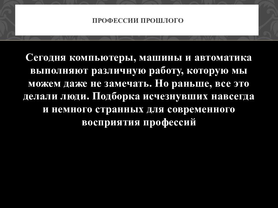 Сегодня компьютеры, машины и автоматика выполняют различную работу, которую мы можем даже не замечать. Но раньше, все это делали люди. Подборка исчезнувших навсегда и немного странных для современного восприятия профессий Профессии прошлого