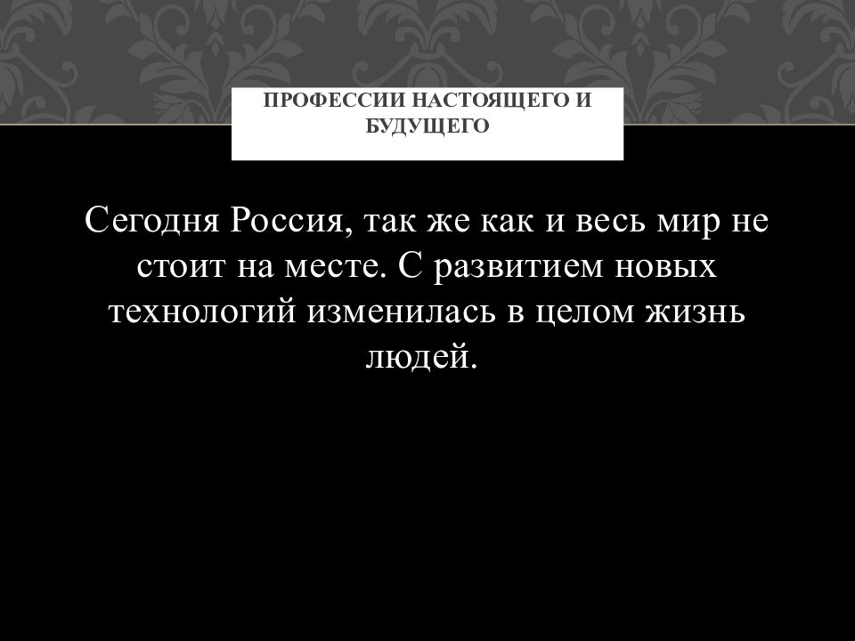 Сегодня Россия, так же как и весь мир не стоит на месте. С развитием новых технологий изменилась в целом жизнь людей. Профессии настоящего и будущего