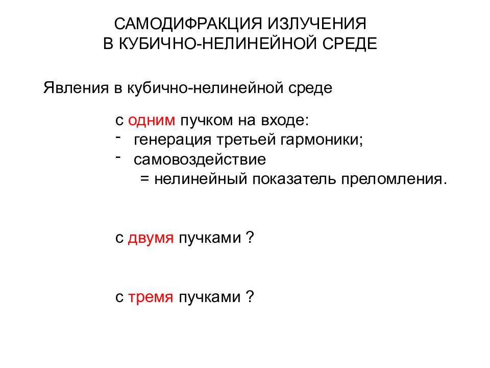 САМОДИФРАКЦИЯ ИЗЛУЧЕНИЯ В КУБИЧНО-НЕЛИНЕЙНОЙ СРЕДЕ с одним пучком на входе: генерация третьей гармоники; самовоздействие = нелинейный показатель преломления. с двумя пучками ? с тремя пучками ? Явления в кубично-нелинейной среде