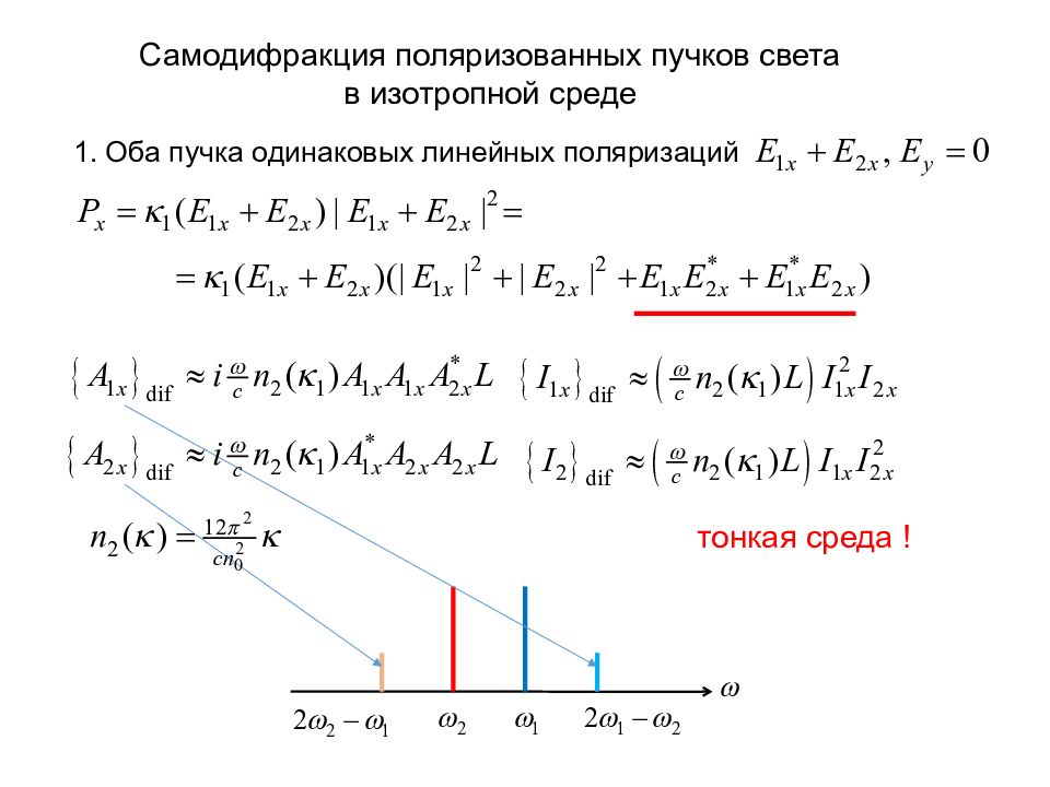 Самодифракция поляризованных пучков света в изотропной среде 1. Оба пучка одинаковых линейных поляризаций тонкая среда !