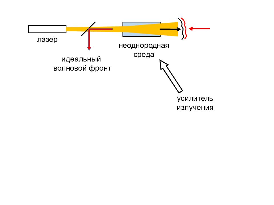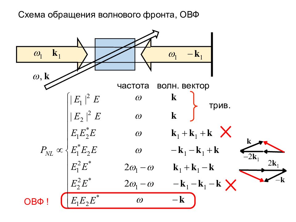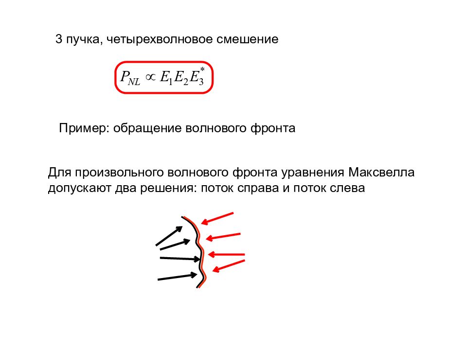 3 пучка, четырехволновое смешение Пример: обращение волнового фронта Для произвольного волнового фронта уравнения Максвелла допускают два решения: поток справа и поток слева