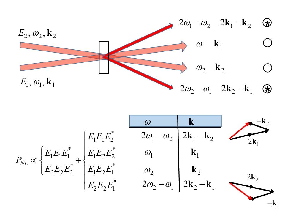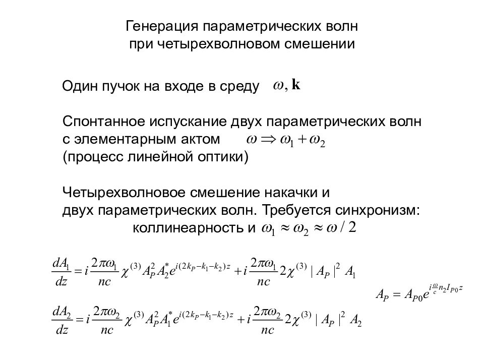 Генерация параметрических волн при четырехволновом смешении Один пучок на входе в среду Спонтанное испускание двух параметрических волн с элементарным актом (процесс линейной оптики) Четырехволновое смешение накачки и двух параметрических волн. Требуется синхронизм: коллинеарность и