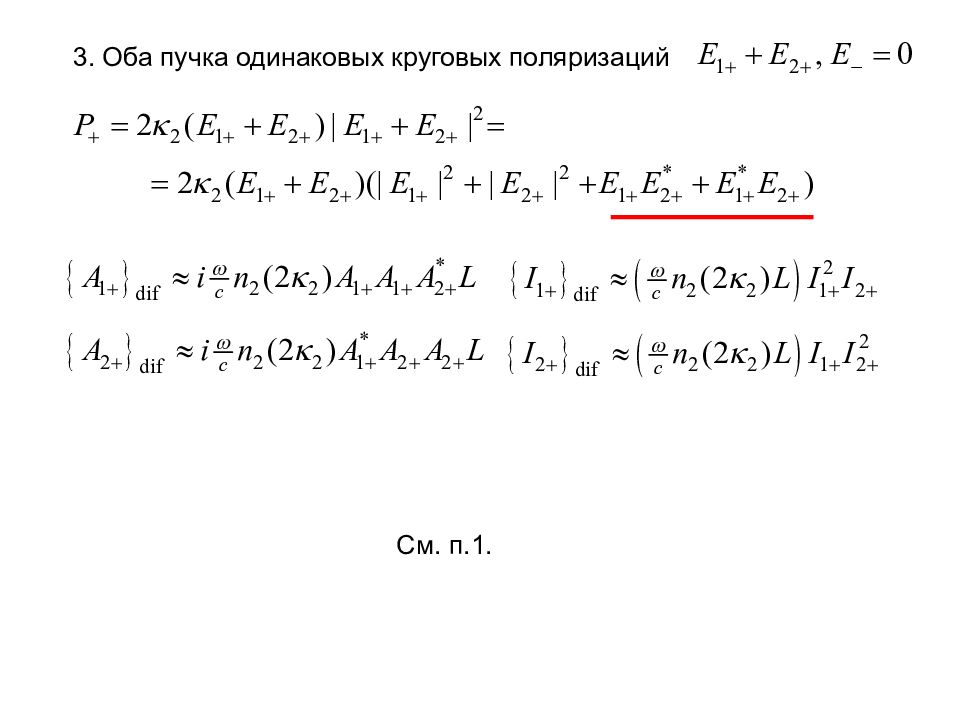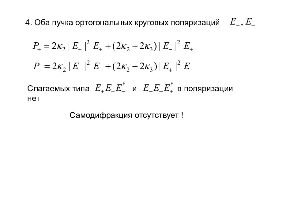 4. Оба пучка ортогональных круговых поляризаций Слагаемых типа и в поляризации нет Самодифракция отсутствует !