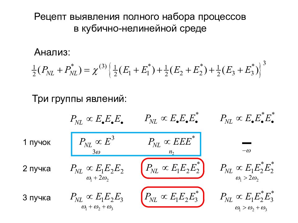 Рецепт выявления полного набора процессов в кубично-нелинейной среде Анализ: Три группы явлений: 1 пучок 2 пучка 3 пучка –