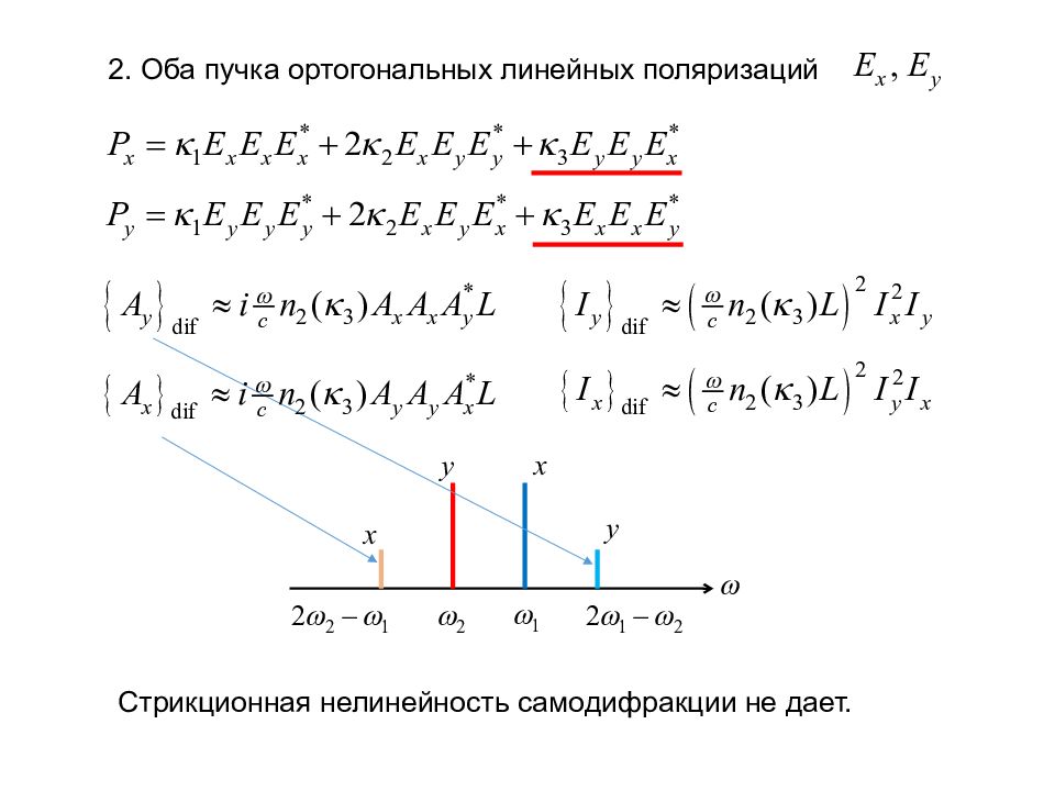 2. Оба пучка ортогональных линейных поляризаций Стрикционная нелинейность самодифракции не дает.