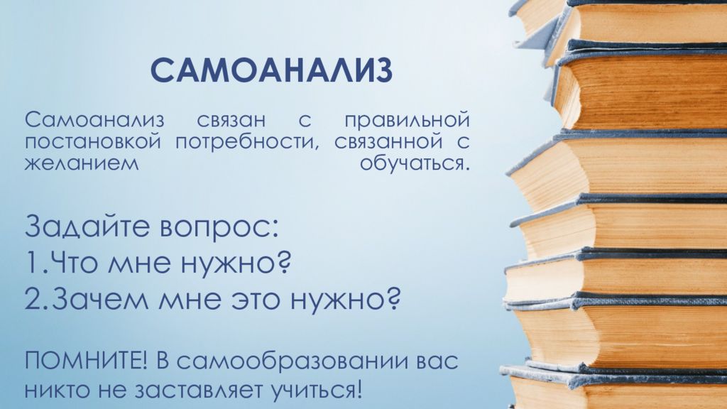 САМОАНАЛИЗ Задайте вопрос : Что мне нужно? Зачем мне это нужно ? ПОМНИТЕ! В самообразовании вас никто не заставляет учиться!