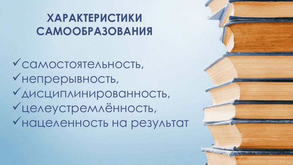 ХАРАКТЕРИСТИКИ САМООБРАЗОВАНИЯ самостоятельность, непрерывность, дисциплинированность, целеустремлённость, нацеленность на результат