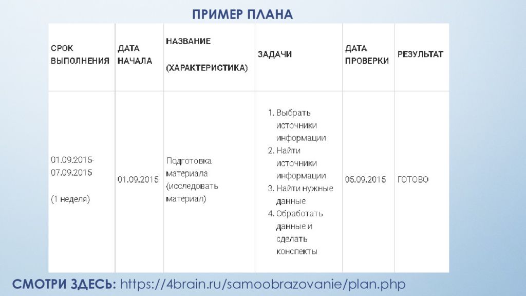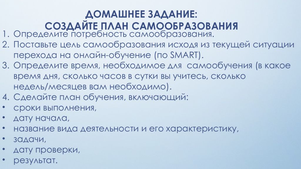 ДОМАШНЕЕ ЗАДАНИЕ: СОЗДАЙТЕ ПЛАН САМООБРАЗОВАНИЯ Определите потребность самообразования. Поставьте цель самообразования исходя из текущей ситуации перехода на онлайн-обучение (по SMART). Определите время, необходимое для самообучения (в какое время дня, сколько часов в сутки вы учитесь, сколько недель/месяцев вам необходимо). Сделайте план обучения, включающий: сроки выполнения, дату начала, название вида деятельности и его характеристику, задачи, дату проверки, результат.