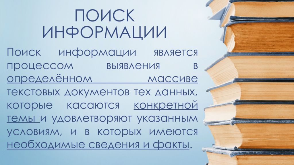 Поиск информации является процессом выявления в определённом массиве текстовых документов тех данных, которые касаются конкретной темы и удовлетворяют указанным условиям, и в которых имеются необходимые сведения и факты.