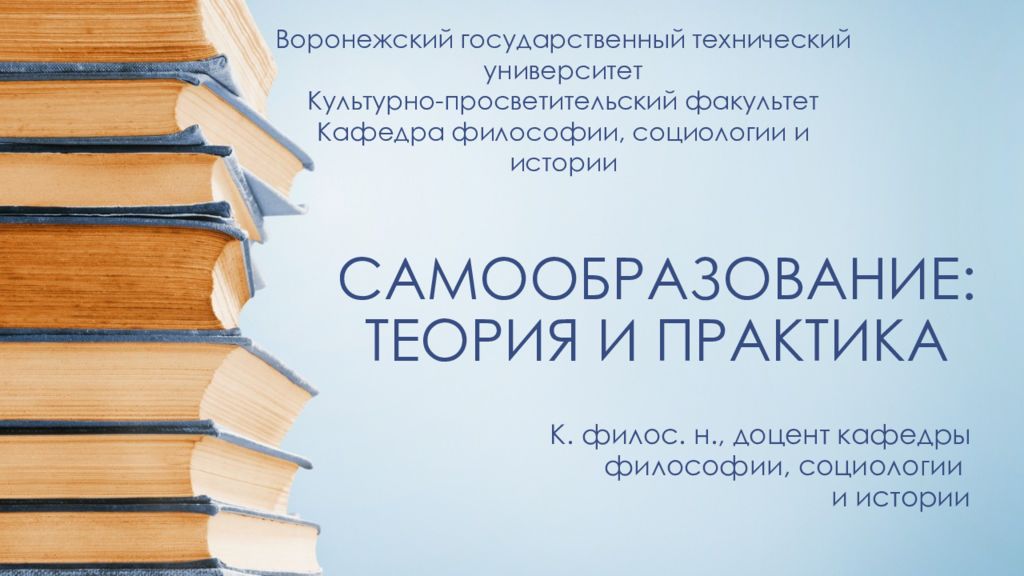 К. филос. н., доцент кафедры философии, социологии и истории Воронежский государственный технический университет Культурно-просветительский факультет Кафедра философии, социологии и истории