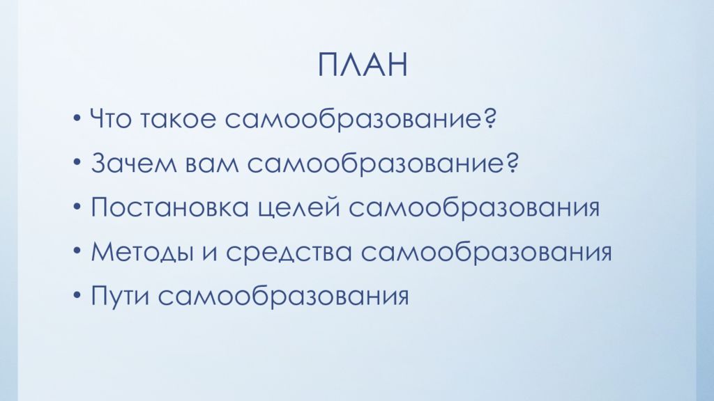 Что такое самообразование ? Зачем вам самообразование? Постановка целей самообразования Методы и средства самообразования Пути самообразования