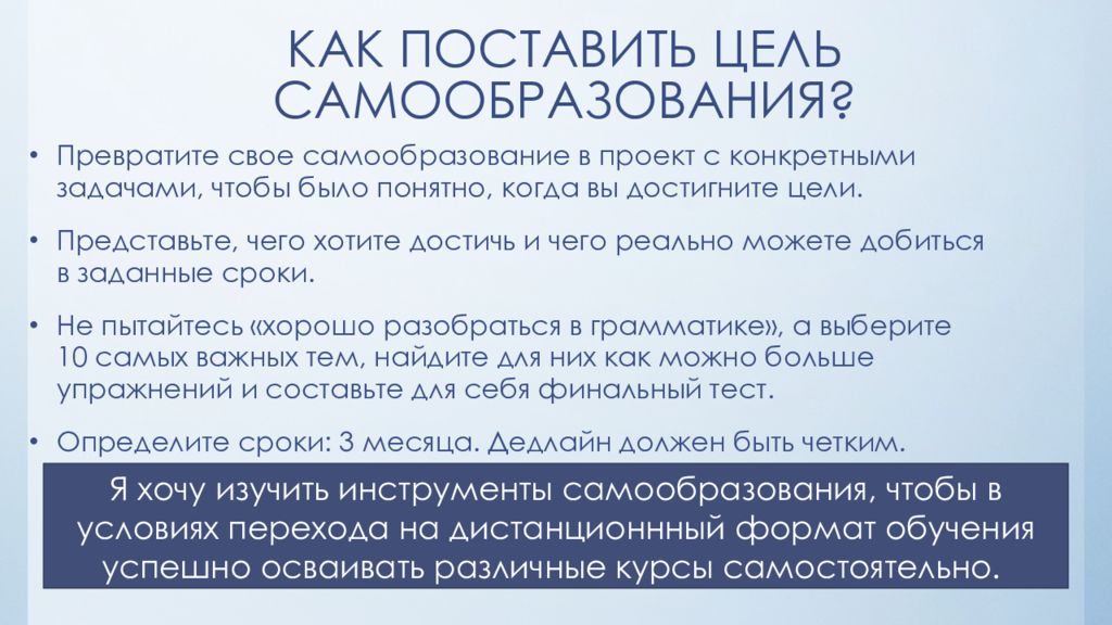 Превратите свое самообразование в проект с конкретными задачами, чтобы было понятно, когда вы достигните цели. Представьте, чего хотите достичь и чего реально можете добиться в заданные сроки. Не пытайтесь «хорошо разобраться в грамматике», а выберите 10 самых важных тем, найдите для них как можно больше упражнений и составьте для себя финальный тест. Определите сроки: 3 месяца. Дедлайн должен быть четким. Я хочу изучить инструменты самообразования, чтобы в условиях перехода на дистанционнный формат обучения успешно осваивать различные курсы самостоятельно.