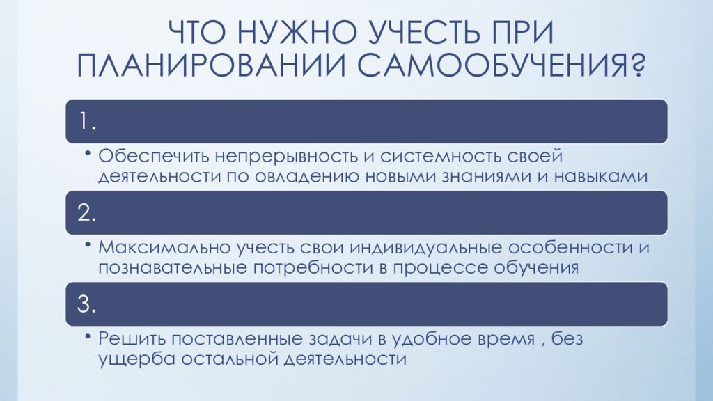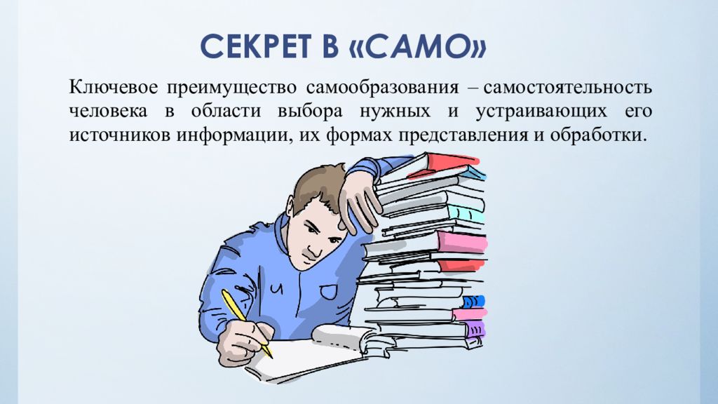 Ключевое преимущество самообразования – самостоятельность человека в области выбора нужных и устраивающих его источников информации, их формах представления и обработки.