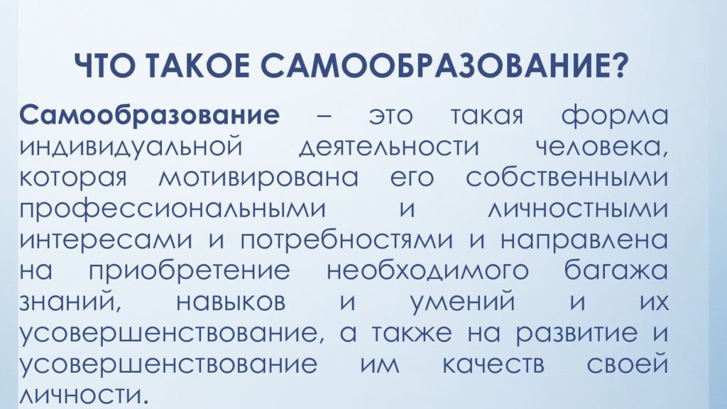 Самообразование – это такая форма индивидуальной деятельности человека, которая мотивирована его собственными профессиональными и личностными интересами и потребностями и направлена на приобретение необходимого багажа знаний, навыков и умений и их усовершенствование, а также на развитие и усовершенствование им качеств своей личности.