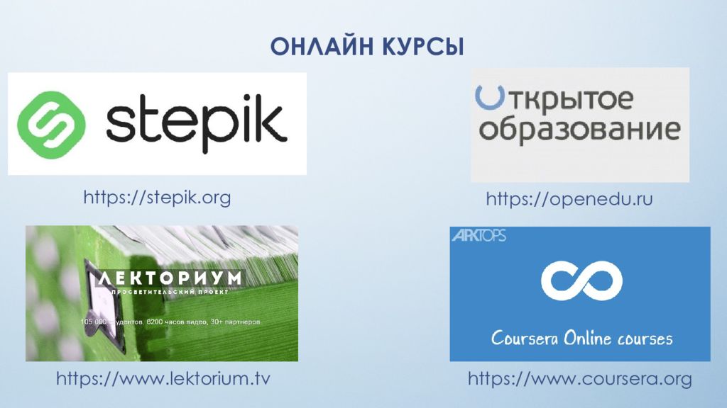 ОНЛАЙН КУРСЫ https://stepik.org https://www.coursera.org https://www.lektorium.tv https://openedu.ru