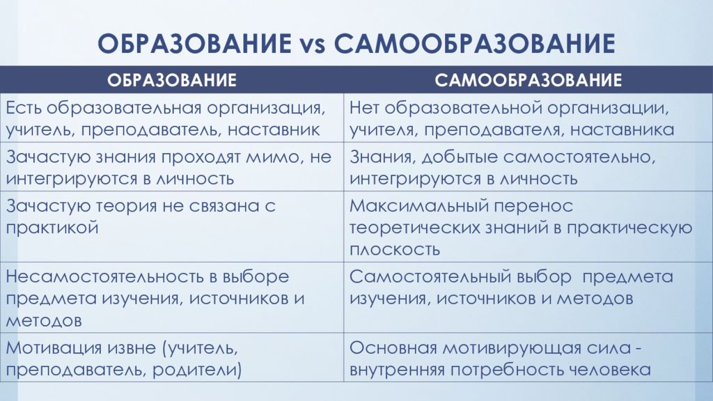 ОБРАЗОВАНИЕ САМООБРАЗОВАНИЕ Есть образовательная организация, учитель, преподаватель, наставник Нет образовательной организации, учителя, преподавателя, наставника Зачастую знания проходят мимо, не интегрируются в личность Знания, добытые самостоятельно, интегрируются в личность Зачастую теория не связана с практикой Максимальный перенос теоретических знаний в практическую плоскость Несамостоятельность в выборе предмета изучения, источников и методов Самостоятельный выбор предмета изучения, источников и методов Мотивация извне (учитель, преподаватель, родители) Основная мотивирующая сила - внутренняя потребность человека ОБРАЗОВАНИЕ vs САМООБРАЗОВАНИЕ