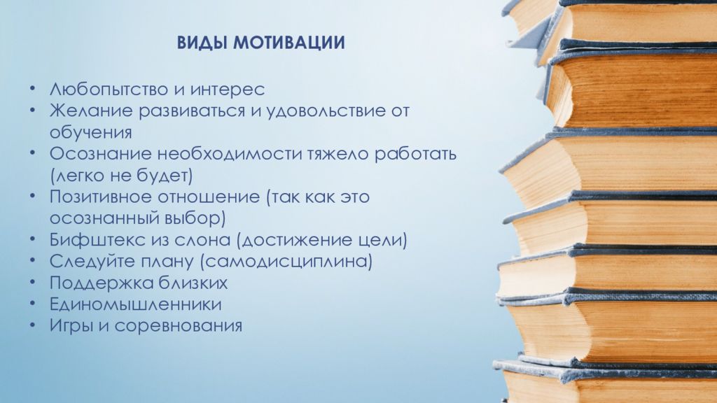 ВИДЫ МОТИВАЦИИ Любопытство и интерес Желание развиваться и удовольствие от обучения Осознание необходимости тяжело работать (легко не будет) Позитивное отношение (так как это осознанный выбор) Бифштекс из слона (достижение цели) Следуйте плану ( самодисциплина) Поддержка близких Единомышленники Игры и соревнования