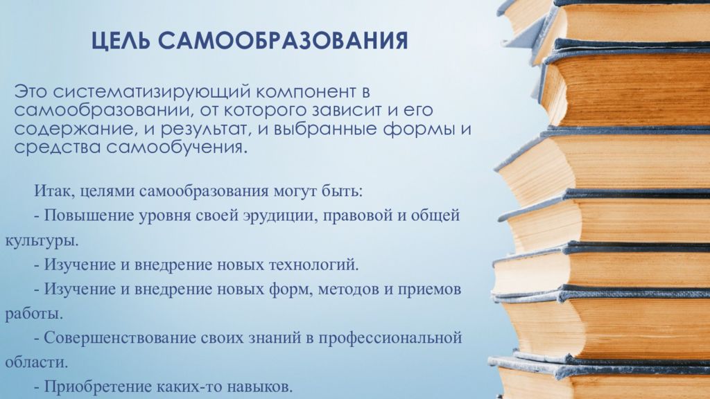 ЦЕЛЬ САМООБРАЗОВАНИЯ Итак, целями самообразования могут быть: - Повышение уровня своей эрудиции, правовой и общей культуры. - Изучение и внедрение новых технологий. - Изучение и внедрение новых форм, методов и приемов работы. - Совершенствование своих знаний в профессиональной области. - Приобретение каких-то навыков.