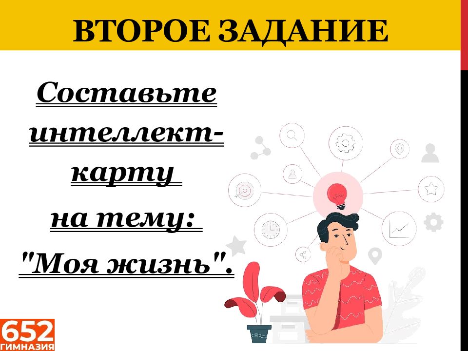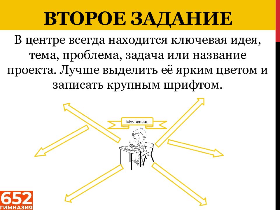 ВТОРОЕ ЗАДАНИЕ В центре всегда находится ключевая идея, тема, проблема, задача или название проекта. Лучше выделить её ярким цветом и записать крупным шрифтом.