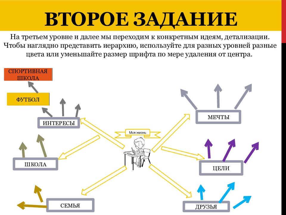 На третьем уровне и далее мы переходим к конкретным идеям, детализации. Чтобы наглядно представить иерархию, используйте для разных уровней разные цвета или уменьшайте размер шрифта по мере удаления от центра. ИНТЕРЕСЫ ШКОЛА СЕМЬЯ ДРУЗЬЯ ЦЕЛИ МЕЧТЫ Ф УТБОЛ СПОРТИВНАЯ ШКОЛА ВТОРОЕ ЗАДАНИЕ