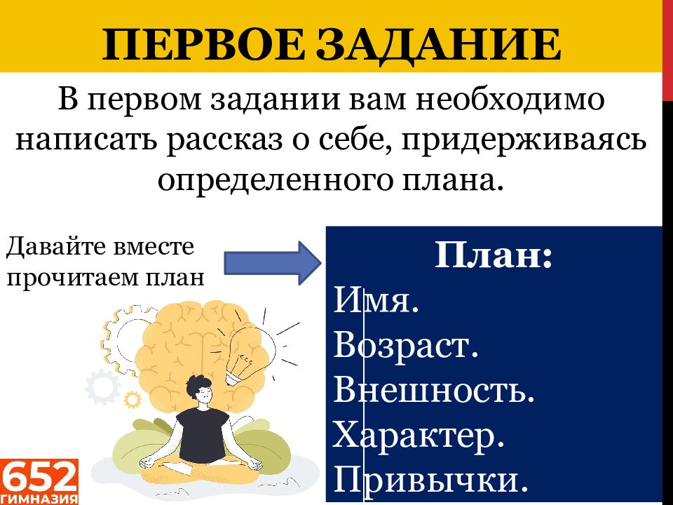 ПЕРВОЕ ЗАДАНИЕ В первом задании вам необходимо написать рассказ о себе, придерживаясь определенного плана. Давайте вместе прочитаем план План: Имя. Возраст. Внешность. Характер. Привычки.