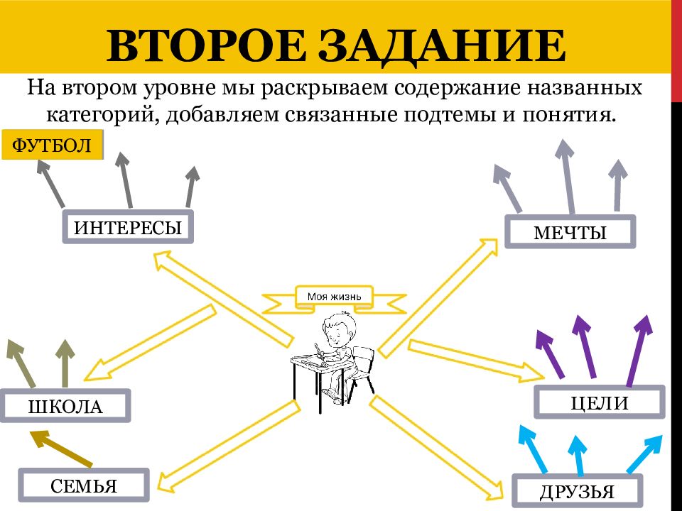 На втором уровне мы раскрываем содержание названных категорий, добавляем связанные подтемы и понятия. ИНТЕРЕСЫ ШКОЛА СЕМЬЯ ДРУЗЬЯ ЦЕЛИ МЕЧТЫ Ф УТБОЛ ВТОРОЕ ЗАДАНИЕ