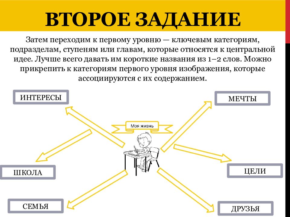 Затем переходим к первому уровню — ключевым категориям, подразделам, ступеням или главам, которые относятся к центральной идее. Лучше всего давать им короткие названия из 1–2 слов. Можно прикрепить к категориям первого уровня изображения, которые ассоциируются с их содержанием. ИНТЕРЕСЫ ШКОЛА СЕМЬЯ ДРУЗЬЯ ЦЕЛИ МЕЧТЫ ВТОРОЕ ЗАДАНИЕ
