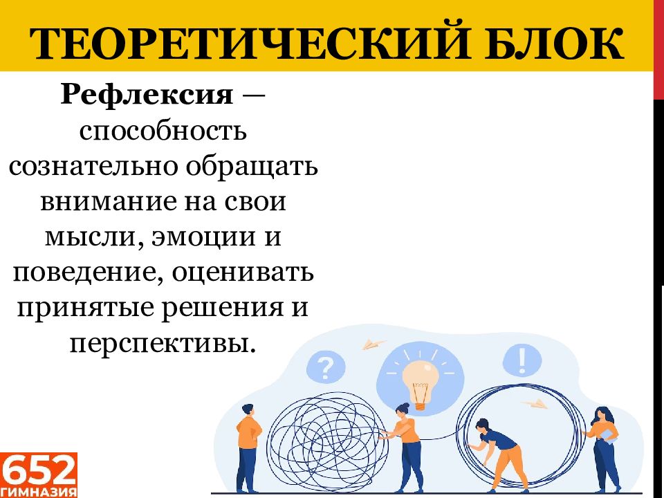 Рефлексия — способность сознательно обращать внимание на свои мысли, эмоции и поведение, оценивать принятые решения и перспективы.