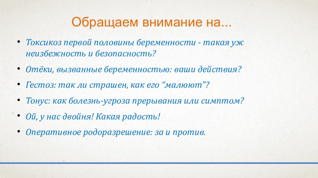 Обращаем внимание на... Токсикоз первой половины беременности - такая уж неизбежность и безопасность ? Отёки, вызванные беременностью : ваши действия ? Гестоз : так ли страшен, как его “ малюют ”? Тонус : как болезнь-угроза прерывания или симптом ? Ой, у нас двойня ! Какая радость ! Оперативное родоразрешение : за и против.