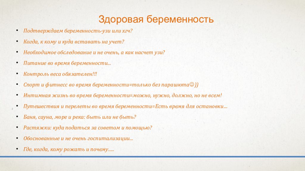 Здоровая беременность Подтверждаем беременность-узи или хгч ? Когда, к кому и куда вставать на учет? Необходимое обследование и не очень, а как насчет узи? Питание во время беременности... Контроль веса обязателен!!! Спорт и фитнесс во время беременности = только без парашюта )) Интимная жизнь во время беременности = можно, нужно, должно, но не всем! Путешествия и перелеты во время беременности = Есть время для остановки… Баня, сауна, море и река : быть или не быть ? Растяжки: куда податься за советом и помощью? Обоснованные и не очень госпитализации... Где, когда, кому рожать и почему …..