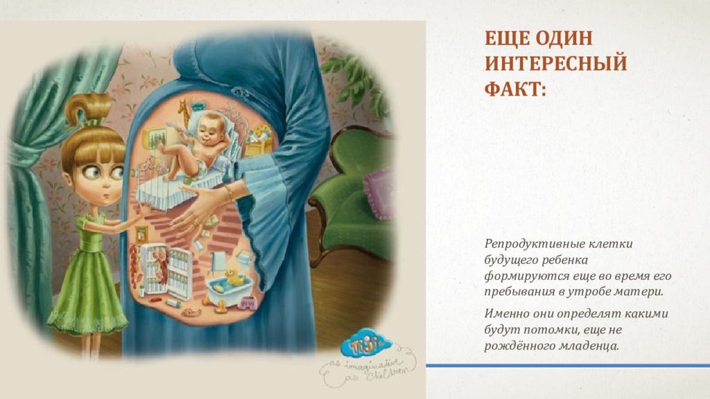 Еще один интересный факт: Репродуктивные клетки будущего ребенка формируются еще во время его пребывания в утробе матери. Именно они определят какими будут потомки, еще не рождённого младенца.