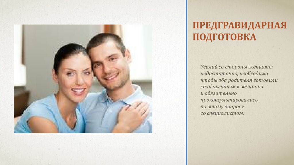 Предгравидарная подготовка Усилий со стороны женщины недостаточно, необходимо чтобы оба родителя готовили свой организм к зачатию и обязательно проконсультировались по этому вопросу со специалистом.