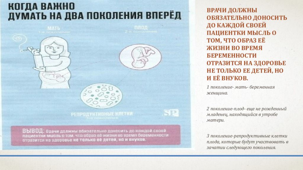 Врачи должны обязательно доносить до каждой своей пациентки мысль о том, что образ её жизни во время беременности отразится на здоровье не только ее детей, но и её внуков. 1 поколение - мать - беременная женщина. 2 поколение-плод - еще не рожденный младенец, находящийся в утробе матери. 3 поколение-репродуктивные клетки плода, которые будут участвовать в зачатии следующего поколения.