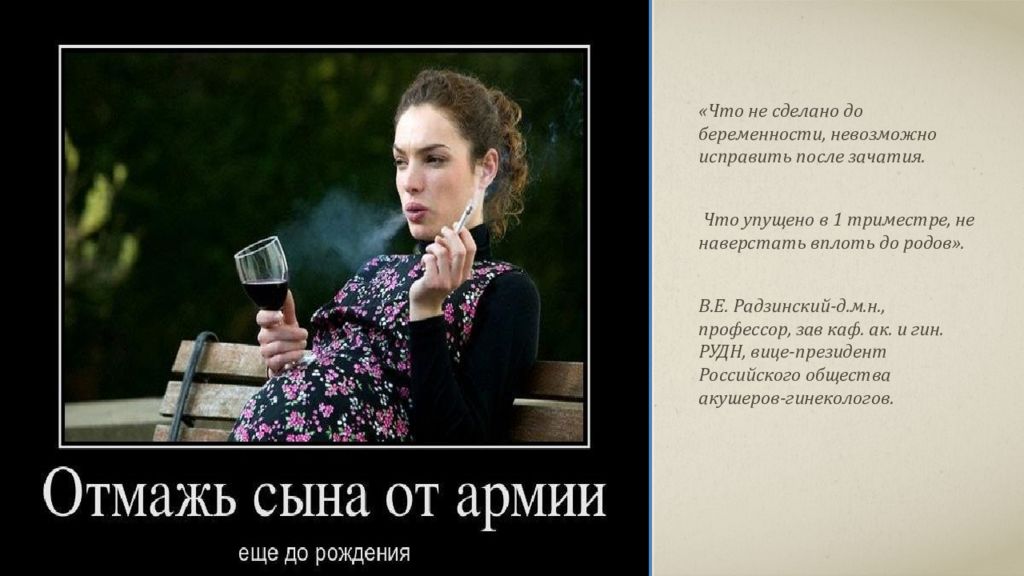 « Что не сделано до беременности, невозможно исправить после зачатия. Что упущено в 1 триместре, не наверстать вплоть до родов ». В.Е. Радзинский-д.м.н., профессор, зав каф. ак. и гин. РУДН, вице-президент Российского общества акушеров-гинекологов.