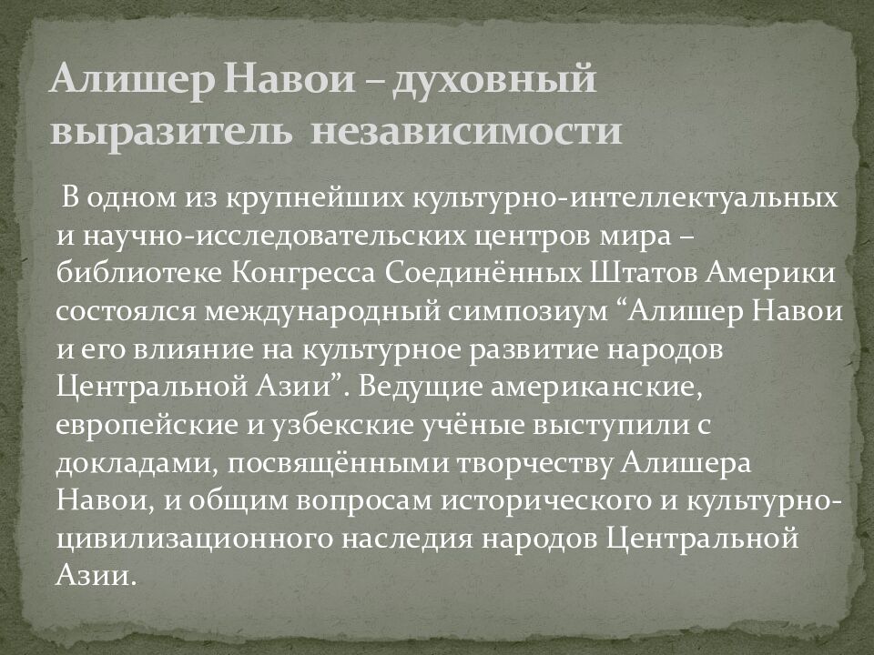 В одном из крупнейших культурно-интеллектуальных и научно-исследовательских центров мира – библиотеке Конгресса Соединённых Штатов Америки состоялся международный симпозиум “ Алишер Навои и его влияние на культурное развитие народов Центральной Азии ”. Ведущие американские, европейские и узбекские учёные выступили с докладами, посвящёнными творчеству Алишера Навои, и общим вопросам исторического и культурно-цивилизационного наследия народов Центральной Азии. Алишер Навои – духовный выразитель независимости