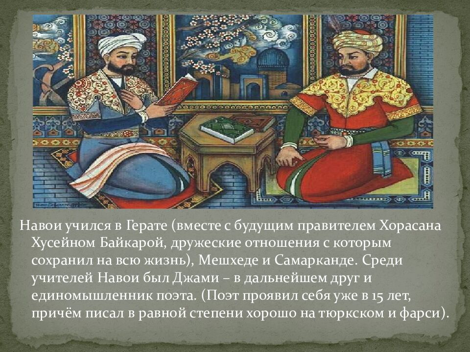 Навои учился в Герате (вместе с будущим правителем Хорасана Хусейном Байкарой, дружеские отношения с которым сохранил на всю жизнь), Мешхеде и Самарканде. Среди учителей Навои был Джами – в дальнейшем друг и единомышленник поэта. (Поэт проявил себя уже в 15 лет, причём писал в равной степени хорошо на тюркском и фарси).