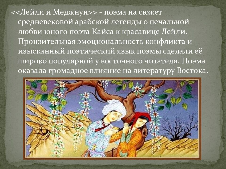 << Лейли и Меджнун >> - поэма на сюжет средневековой арабской легенды о печальной любви юного поэта Кайса к красавице Лейли. Пронзительная эмоциональность конфликта и изысканный поэтический язык поэмы сделали её широко популярной у восточного читателя. Поэма оказала громадное влияние на литературу Востока.